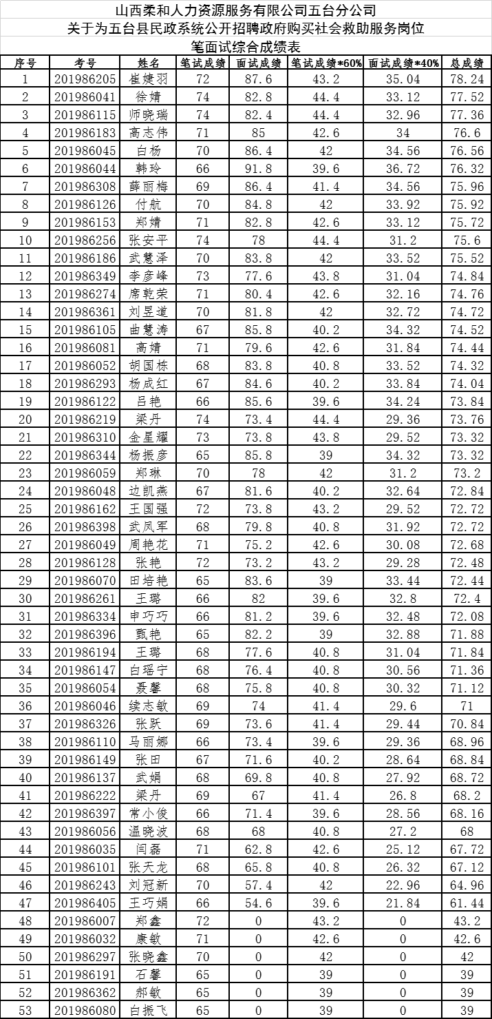2019年五台县民政系统公开招聘政府购买社会救助经办服务工作人员已完成笔试和面试工作,按照《山西柔和人力资源服务有限公司五台分公司关于为五台县民政局公开招聘政府购买社会救助经办服务岗位派遣人员的公告》要求,笔试成绩的60%和面试成绩的40%进行了综合成绩排名,现对综合成绩进行公示。