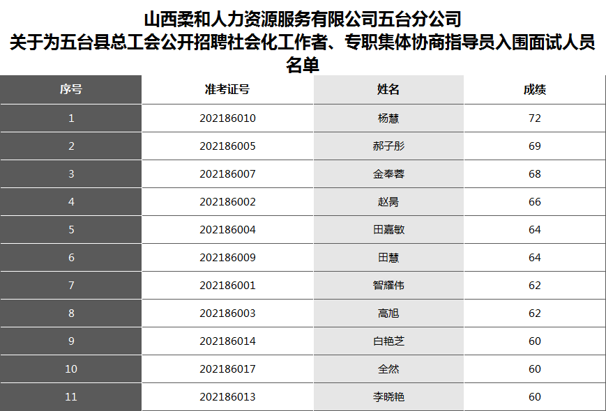 山西柔和人力资源服务有限公司五台分公司 关于为五台县总工会公开招聘政府购买社会化工作者、专职集体协商指导员入围面试人员的公告